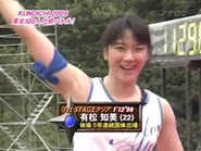 In her only appearance at KUNOICHI 2009 which adopted a new format at the First Stage, Arimatsu is known by her group that included one of two Japanese women to cleared the First Stage in SASUKE, Nishimura Chie. From there, she was able to dismount the Buranchō easily as Nishimura have failing by overshot landing and grabbed a red flag in just only 72 seconds, advancing to the Second Stage.