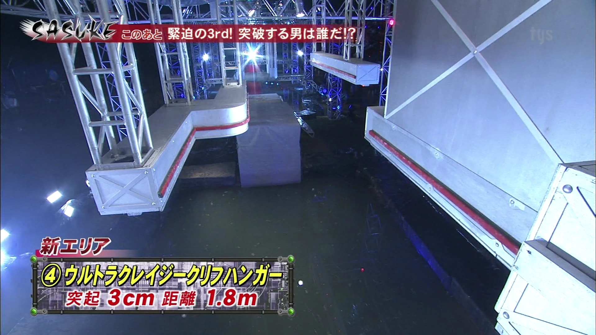 - In SASUKE 10, 11, and 13 to 17, the platform was placed slightly underneath the third ledge, so competitors could dismount after traversing around three-quarters of the third ledge's length.