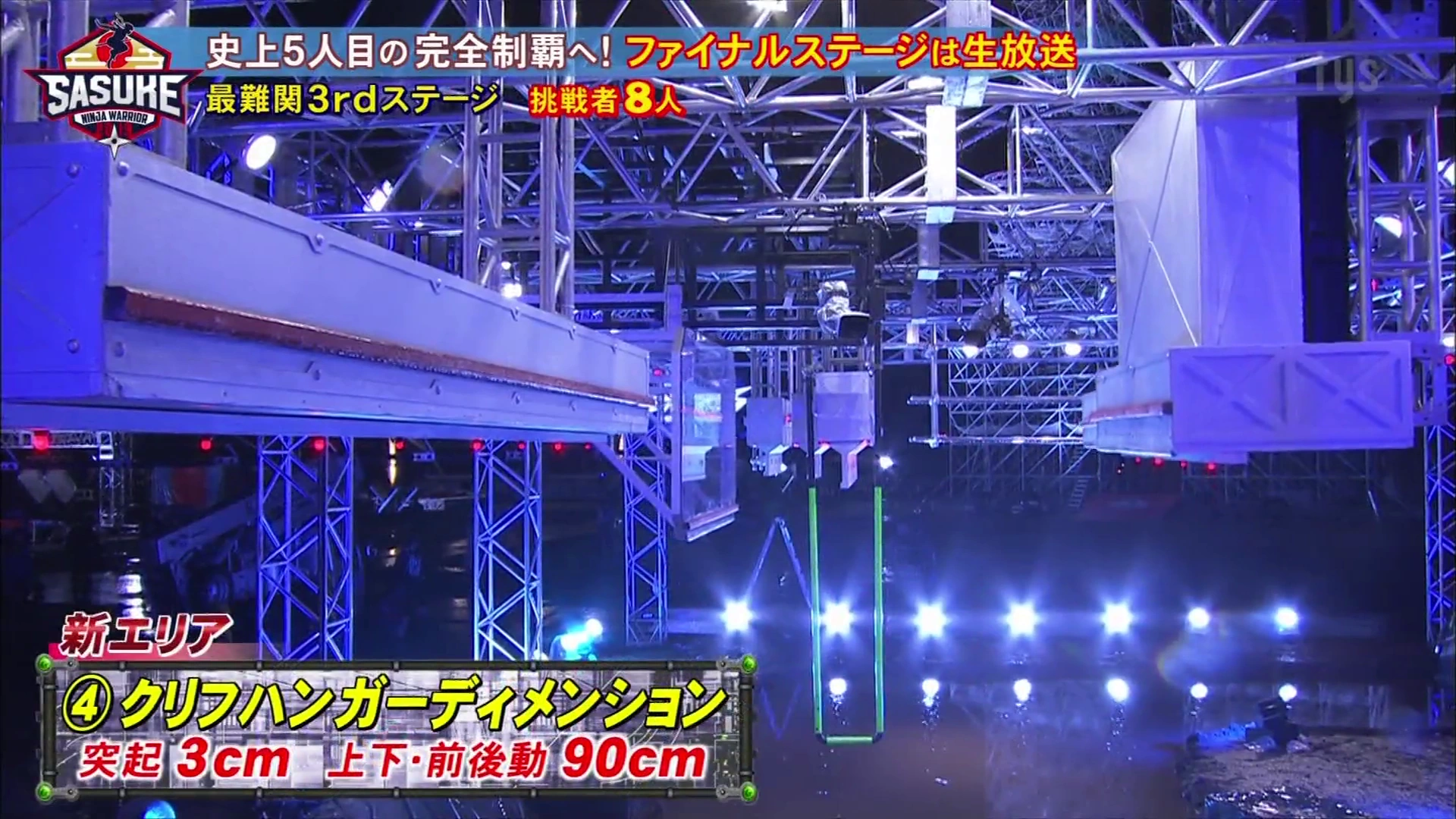 The eighth and current version of Cliffhanger is Cliffhanger Dimension (クリフハンガーディメンション), being introduced in SASUKE 37. It again received major modifications compared to the previous version, with the second ledge now moving vertically, with its halfway curvature reduced, while the third ledge was embedded on a Plexiglas board that moves horizontally by 90cm. However, in SASUKE 38, the second ledge moved by 1 metre, an increment of 10 cm from its debut tournament.