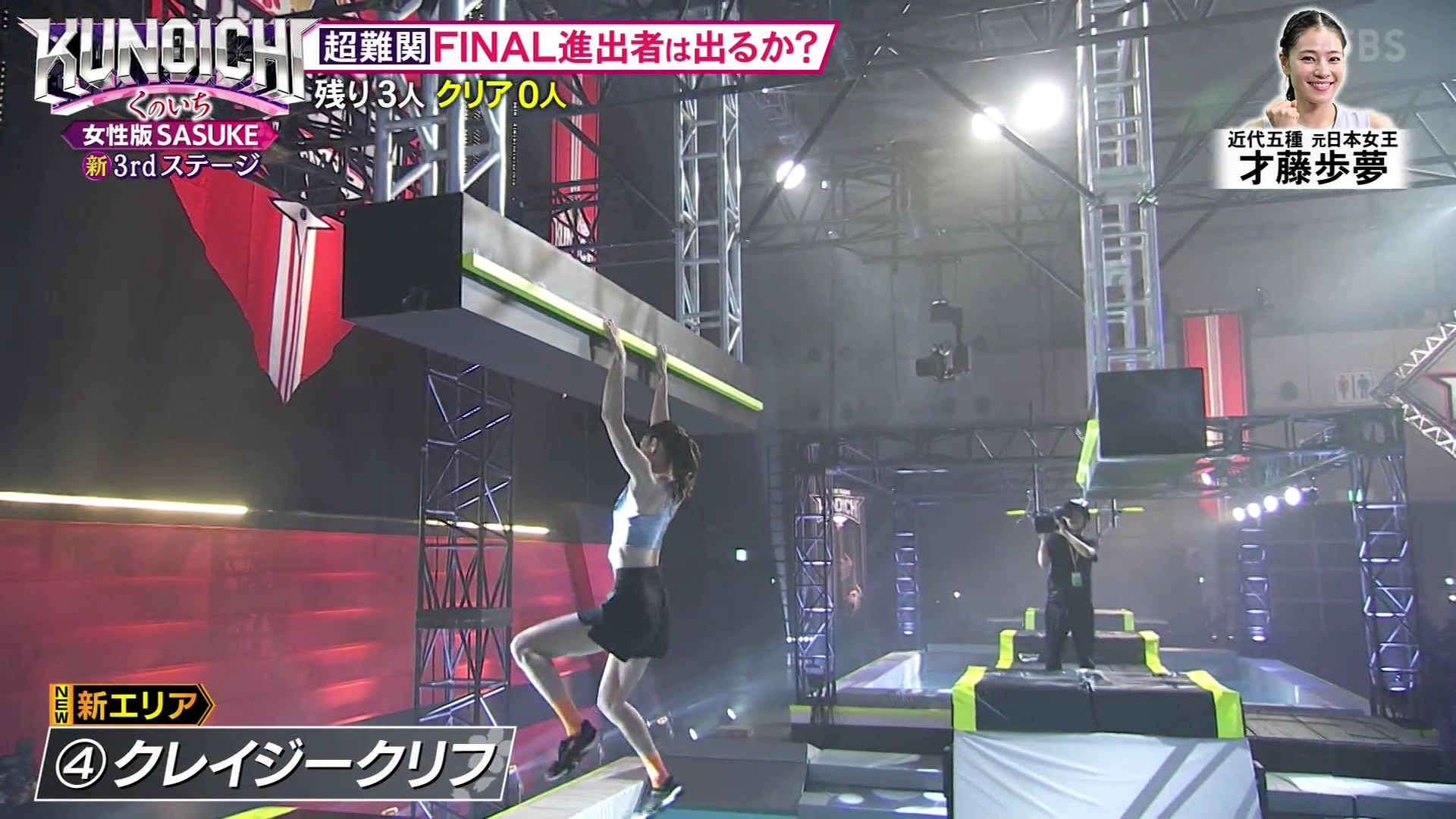 It was attempted by three competitors, with AYA being the only one who failed, while Watanabe Kana and Izumi Hikari (making her the only competitor to attempt and clear both versions of Cliffhanger used in KUNOICHI) easily cleared it. In the following tournament, it was replaced by Planet Bridge.