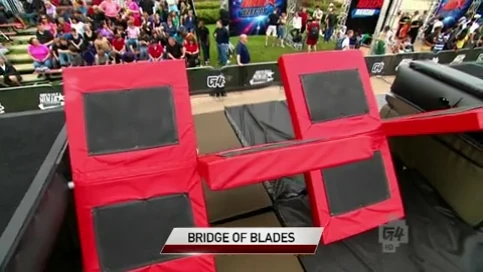 Cross Bridge, called Bridge of Blades, appeared as the third obstacle on American Ninja Warrior 2 in qualifying and semifinal. Although there was no barrier across center axis, the padding caused it to be in a plus-shape, providing an interesting threat for the competitors. It was one of the deadliest obstacles during qualifying, eliminating many top competitors such as Brett Sims, Paul Darnell, and Rick Huelga. It was also extremely dangerous, as one competitor, Robert Mullinix, suffered a wound to the head that caused him to bleed. During the semi-finals, it eliminated a few competitors, such as Andrew Karsen, Ibrahim Peek and Andrew Taber.