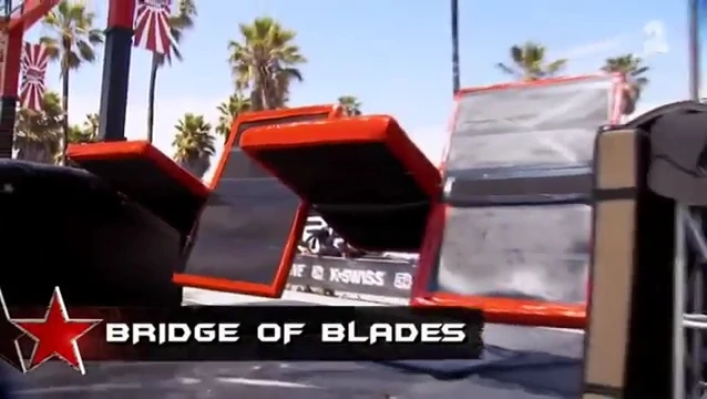 Cross Bridge (クロスブリッジ), called Bridge of Blades in English broadcasts, was a First Stage obstacle first introduced in SASUKE 13. It was placed immediately after Sandan Rolling Maruta to add difficulty, as some competitors will feel a bit dizzy while attempting it.