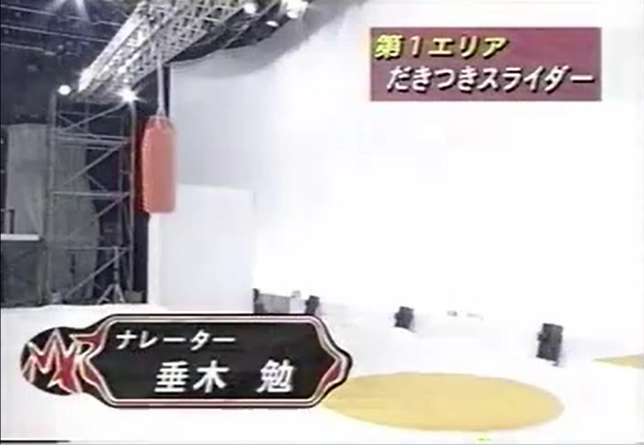 The Dakitsuki Slider (だきつきスライダー) was the first obstacle featured in the original single-stage Kinniku Banzuke version of KUNOICHI.