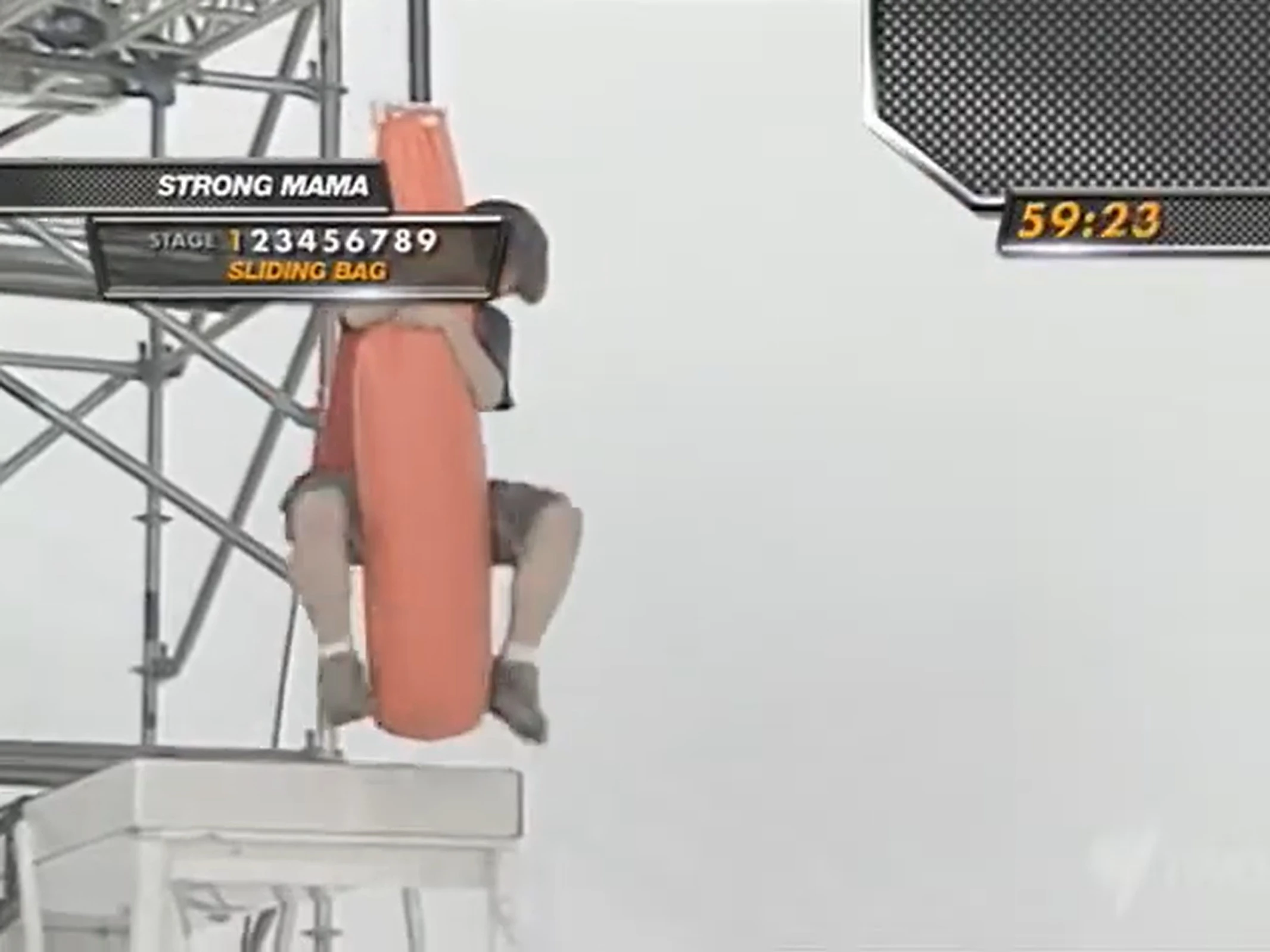 The obstacle's concept revolved around competitors having to grab onto a large orange sandbag and slide down a long track, before letting go at just the right time to land on a circular platform situated in a pool of water, before the obstacle slammed into a set of padding at the end of the track. Competitors would then jump off the platform to get the next pathway, which also crossed with the ending pad, forcing them to get around the sandbag as well before reaching the next obstacle.