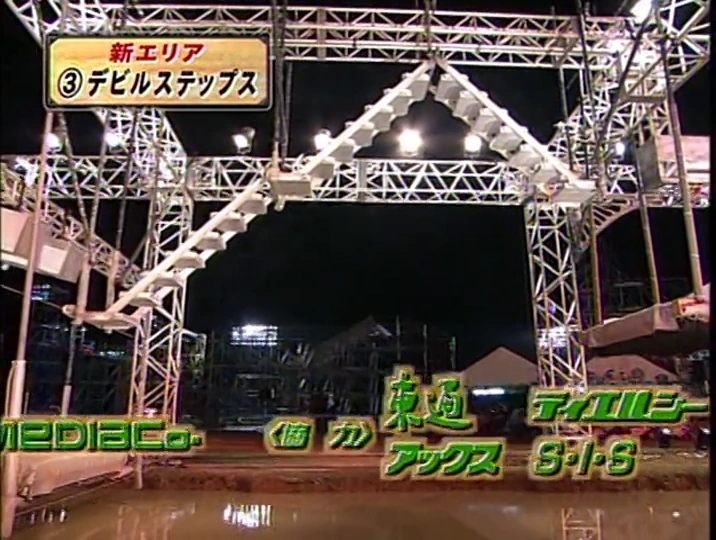 Devil Steps (デビルステップス) is an obstacle introduced in SASUKE 19's Third Stage, replacing Curtain Swing as the third obstacle from the previous tournament. In spite of the fact that it was first introduced in SASUKE 19, due to the dominance of Second Stage, this obstacle was unattempted in the tournament. However, TBS teased viewers by showing a tester fail there in SASUKE 19's Opening.