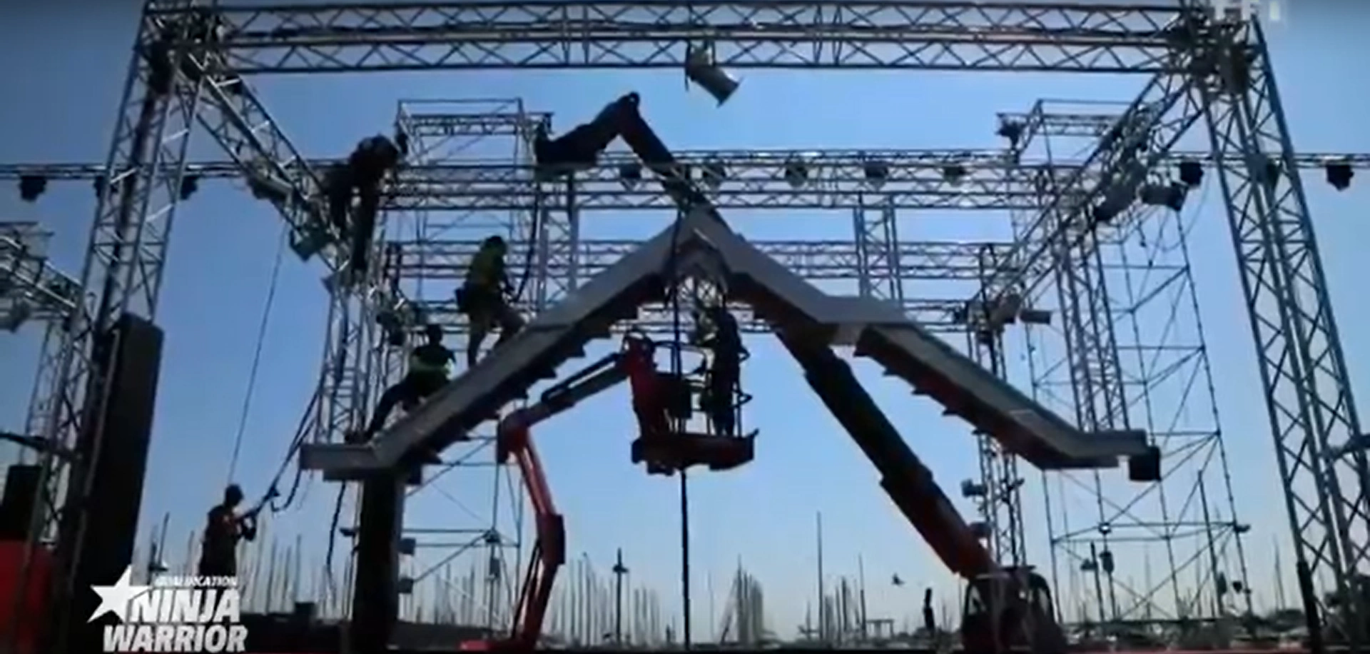 The backstage crew assembling Devil Steps in Ninja Warrior France 4