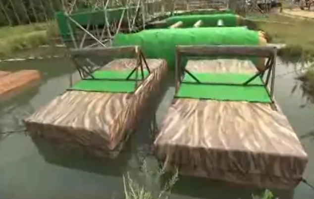 The Fuansou (不安走) was an obstacle introduced during KUNOICHI 8. The functionality of the obstacle is for competitors to jump onto the raft while racing in groups of four. They then must go over a hurdle suspended on the raft, and then jump to a platform on the other side. The obstacle was very easy, and the only competitors to fail it failed the jump to the platform.