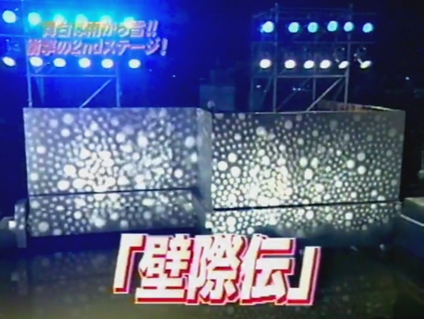 The Kabegiwa Den (壁際伝) was a KUNOICHI 2's Second Stage obstacle. It consisted of ledges similar to Narrow, but was separated into three parts in a zig-zag shape and lacked the bumps, servicing as the second obstacle, replacing the Kaiten Bashira, and being the last obstacle of the stage's timed section. It was first attempted by Mizuno Yūko, and similar to the Narrow, the Kabegiwa Den eliminated neither Mizuno Yūko nor Watanabe Kazue who made to the Final Stage in this tournament, and was replaced by the Chou Touhan in the next tournament.