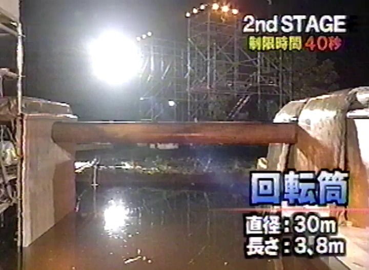 The Kaiten Tsutsu (回転筒) was the third obstacle of the Second Stage from KUNOICHI 3 to KUNOICHI 5 and KUNOICHI 7. Similar to the Burasagari Maruta, which was used in SASUKE, and was also called as the Spinning Log during the broadcast of Ninja Warrior, competitors had to run across a log, which was 30cm in diameter and 3.8m in length to reach the landing platform. From KUNOICHI 4, the log was lengthened to 5 meters in length.