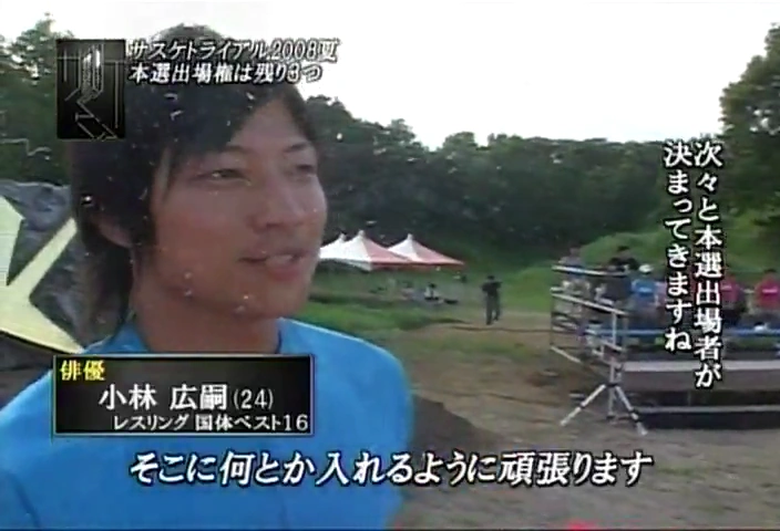 Kobayashi Hirotsugu (小林 博嗣) is an action actor (similar to Kane Kosugi) who has only competed once, even though he has tried to qualify several times through the SASUKE Trials. His only known appearance was in SASUKE 19 where he failed the Jumping Spider. His run was all cut but his result was known through a recent interview with Mori Wataru.
