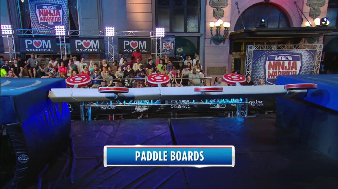 On American Ninja Warrior 9, the Paddle Boards appeared as the fourth obstacle in Denver. The obstacle was modified once again by adding two more paddles (for a total of 8 paddles, 4 on each side) and is now 24 feet of length.
