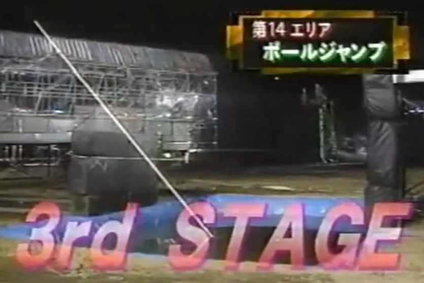 Pole Jump (ポールジャンプ), called Super Vault in English broadcasts, was the first obstacle of Third Stage in SASUKE 3 and 4. It was simply a pole with a fixed axis in a water pit that the competitors must grab onto and swing to a landing platform. This obstacle shared many aspects and/or was most likely inspired by the Poles Apart game from another TBS gameshow Takeshi's Castle, albeit without a fixed axis in the water pit.
