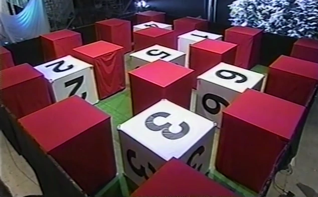 Pyramid (ピラミッド) is an obstacle from the Egypt Stage (3rd Stage) of VIKING Family Muscle. This stage featured a maze with 6 large moveable blocks. Two competitors must attempt the maze while a third competitor on an overhead deck calls out instructions. Blocks may be flipped, but cannot be pushed or slid.