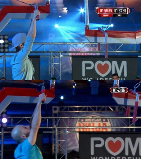 Comparison between the gap between the first and second rails of the Rail Runner during American Ninja Warrior 9's Denver qualifiers (top) and Denver finals (bottom)