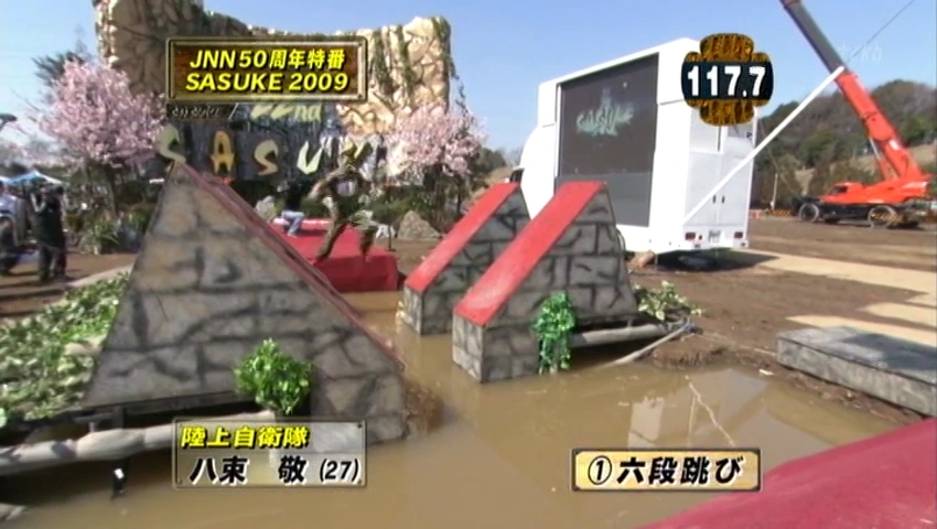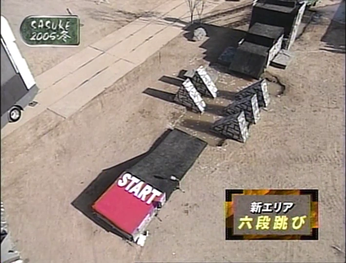 Rokudantobi (六段跳び), called Sextuple Step in English broadcasts, was a First Stage obstacle that was introduced in SASUKE 16 as the first obstacle. It was identical to Godantobi in function, albeit with one additional step added to the right. Additionally, the steps were smaller and raised off of the ground, giving the competitors more room away from the water, but making the gap between each step wider than Godantobi. The steps were raised their lowest in the obstacle's debut in SASUKE 16, would be raised slightly in SASUKE 17, and would be raised significantly more in SASUKE 19, a height that remained for the rest of the obstacle's tenure on the course.