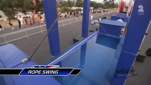 Competitors must grab the rope and swing it across the water to reach the landing platform 20 feet (6.096 meters) away. Although the function of this obstacle was very simple, some competitors had to swing back to the starting platform because they were not successfully making the swing to the landing platform on their first attempt.