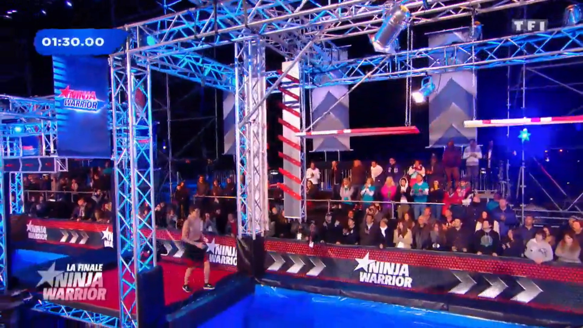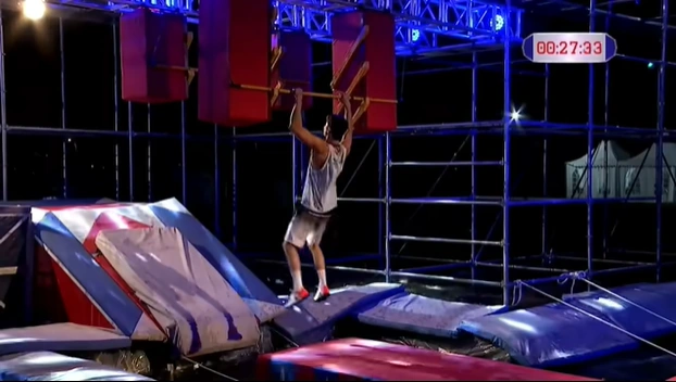 - There is a trampoline added at the starting platform. Therefore, competitors must jump from the trampoline and grab the bar. In some city finals courses, there is a run-up or a 3-foot (0.91-meter) tall platform before competitors can jump to the trampoline.