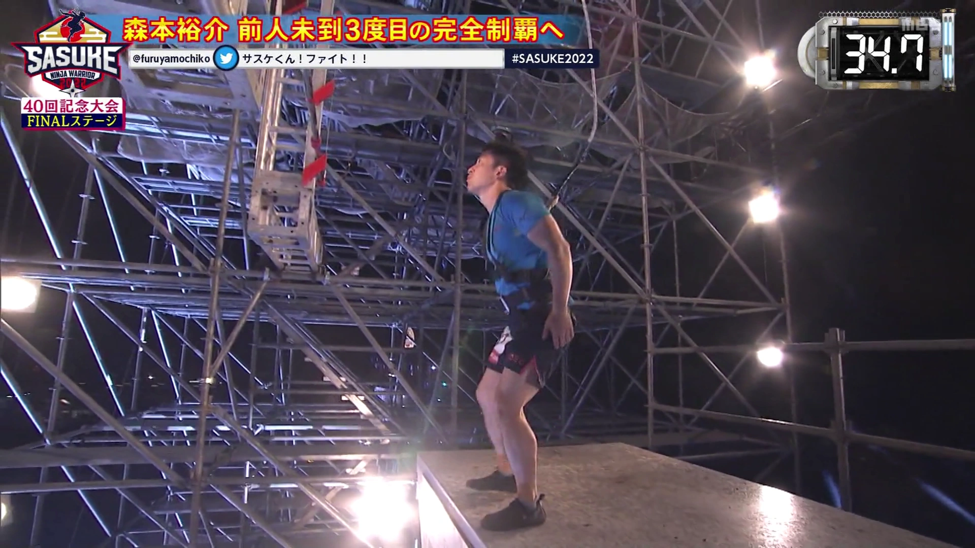 Morimoto returned to Final Stage in SASUKE 38 after his failure on First Stage in the previous tournament. From there, his pace on Salmon Ladder is similar to his attempt in SASUKE 36, but he was able to grab Tsuna Nobori immediately after he cleared the obstacle. This would lead to him clearing the stage with 2.52 seconds remaining, thus achieving his second Kanzenseiha.