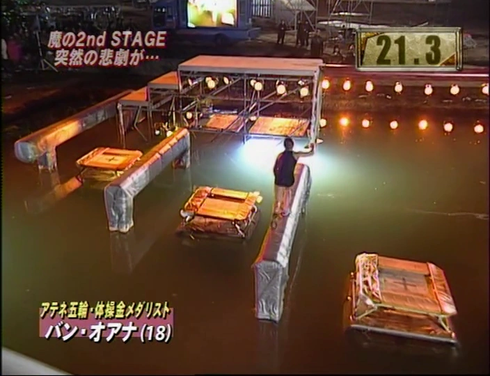 The first version of Sanrentobi was the hardest. The balance beam of the obstacle was thinner than that used for Tenbinbashi. To make the obstacle even harder producers set the balance beam on posts about a meter high. Many people failed to even land on the obstacle using the trampolines and many others timed out.