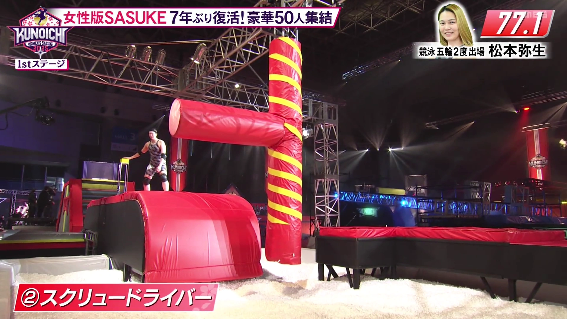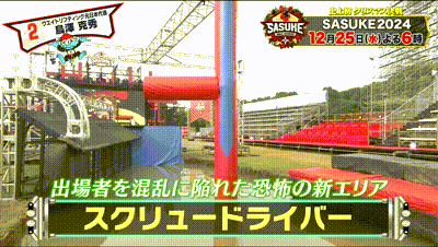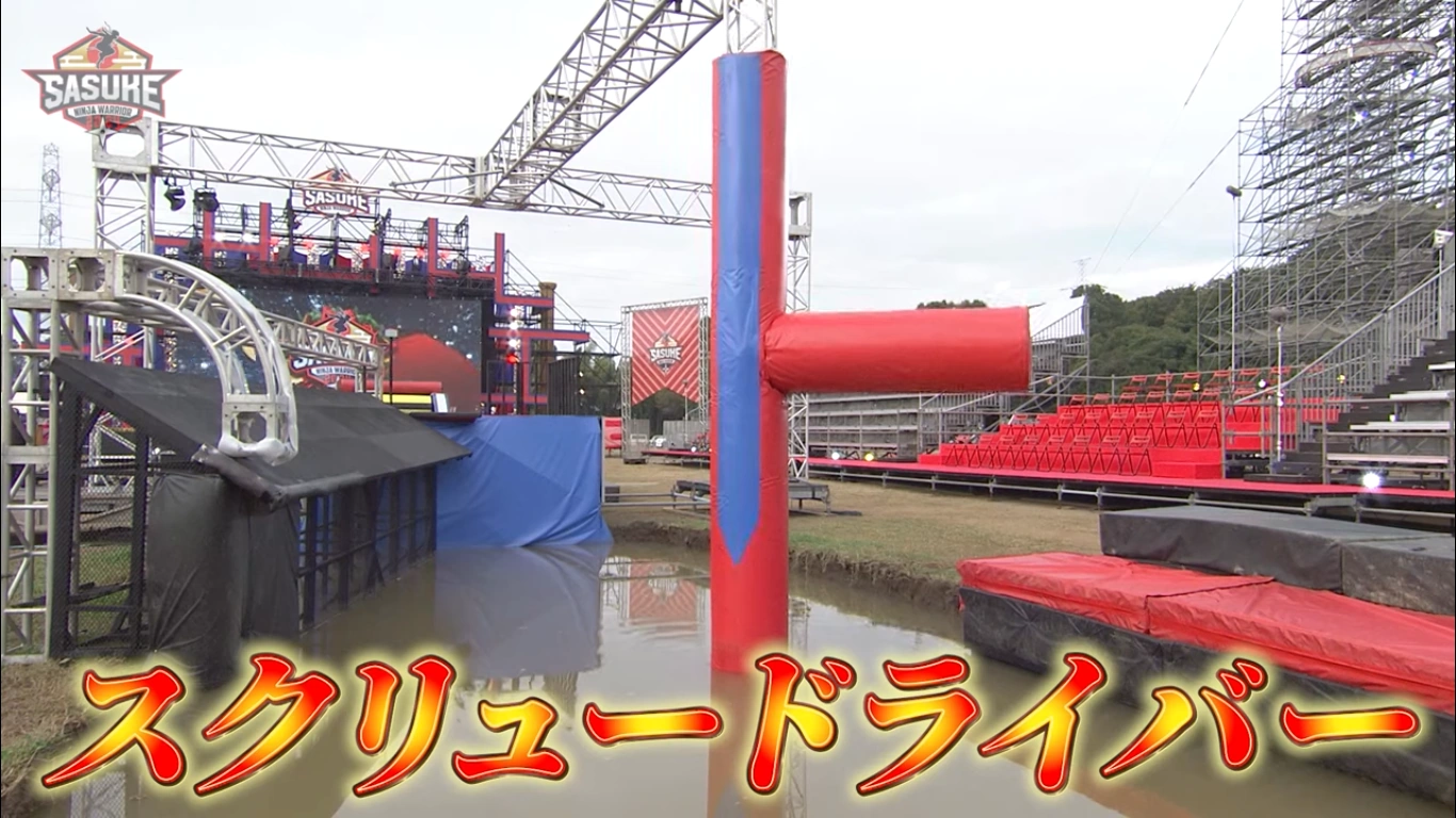 As part of the reboot, the Screwdriver (スクリュードライバー) made an appearance introduced in KUNOICHI 12's First Stage as the second obstacle, replacing the Pipe Hold and Shaking Bridge. Compared to SASUKE, the angled platform was removed. Despite this, the obstacle is slightly easier as out of forty-seven attempts, only four were eliminated.