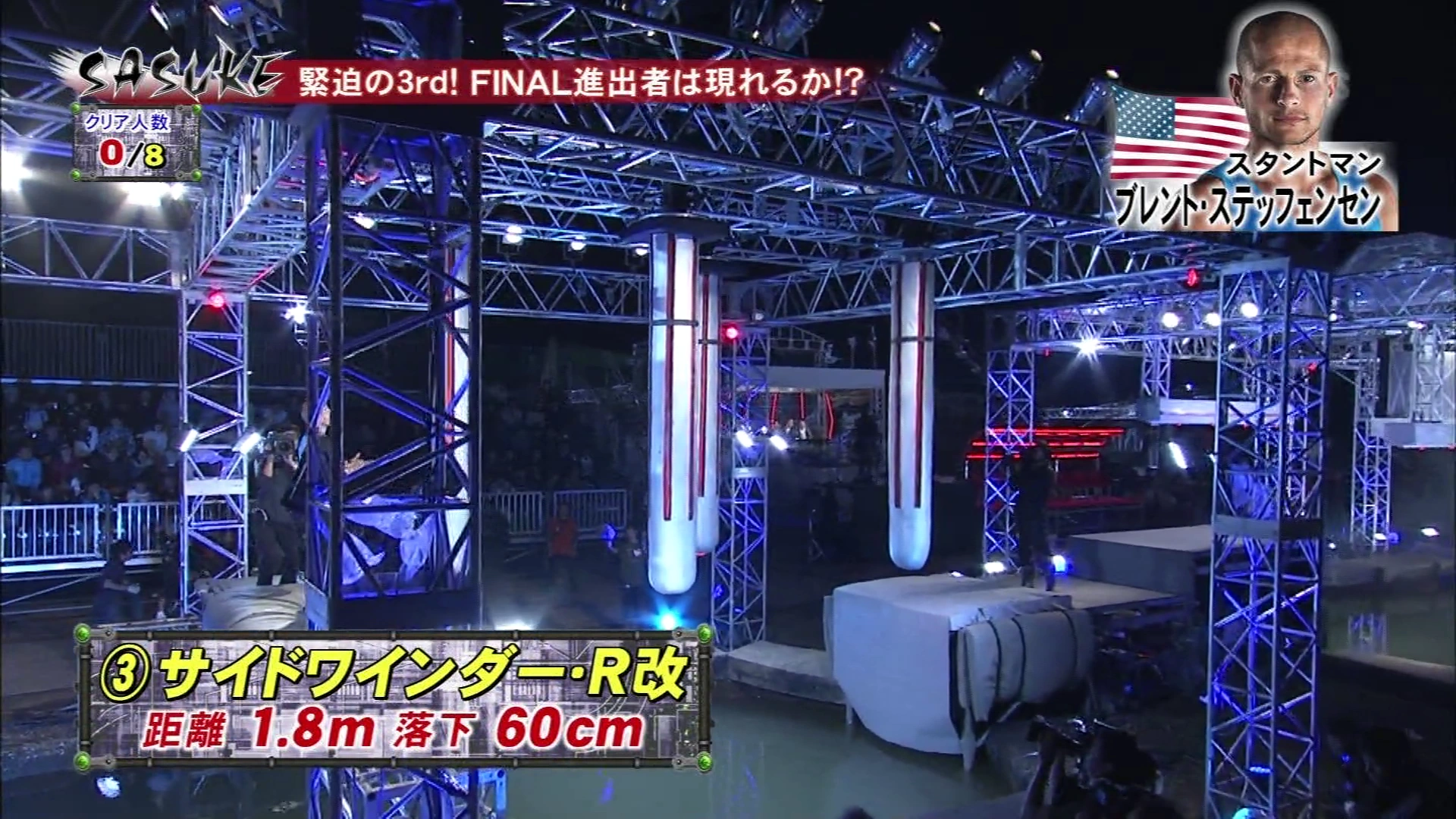This time, the second and third pole would still drop 60cm when the competitors put their weight on them. However, all poles were arranged in a straight line instead of the usual zig-zag formation. The name has left out the letter "R" thus was called Sidewinder Kai (サイドワインダー 改). To make the obstacle harder, it was tied together with the Flying Bar with no rest. With that change, only Drew Drechsel attempted and completed the obstacle due to the immense difficulty of the previous obstacle.