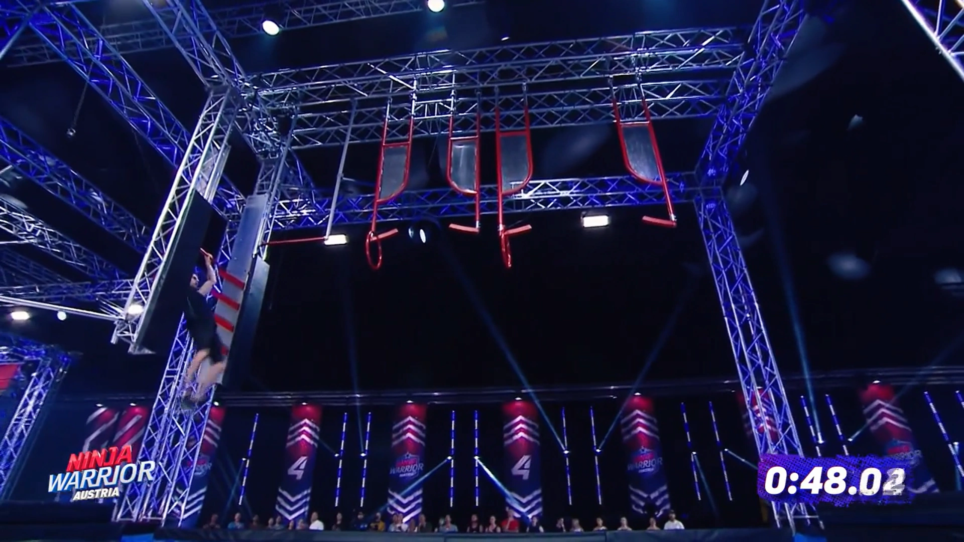 On Ninja Warrior Austria 3, Sky Hooks (Himmelshaken) appeared as the fourth obstacle of the timed section of Stage Two, directly following Salmon Ladder. There were two sets of hooks in total. A perpendicular fixed bar was placed before the first hook. It also appeared to have featured larger rings than in American Ninja Warrior.