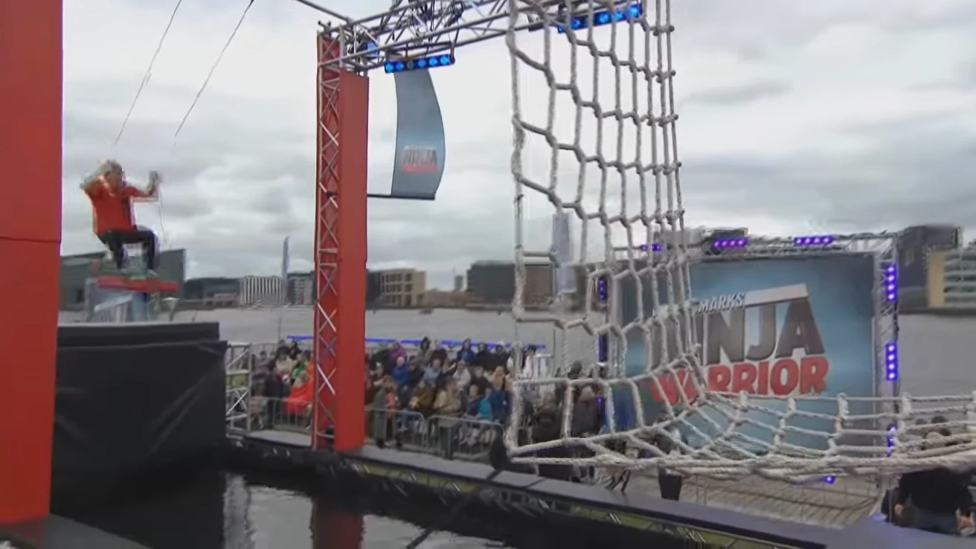 Competitors would start on a platform with a cylindrical swing on it. Then, they had to stand on it and swing long enough to build up lots of momentum to reach a cargo net. Once on it, they had to climb underneath it, carefully not to touch the water, and reach the landing platform.