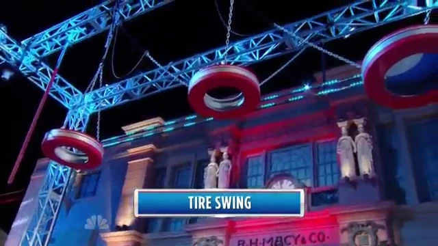 Competitors must use the mini trampoline to reach the pole. From there, competitors must use their upper body to navigate the tires. The first tire would swing freely, the second would tilt in all directions with weight on it, and the last one would tip backwards. The top of the third tire was covered with a cap, so the competitors must grab the inside from underneath. Once at the third tire, they must swing and make a 6-foot (1.83-meter) dismount to the landing platform to advance.