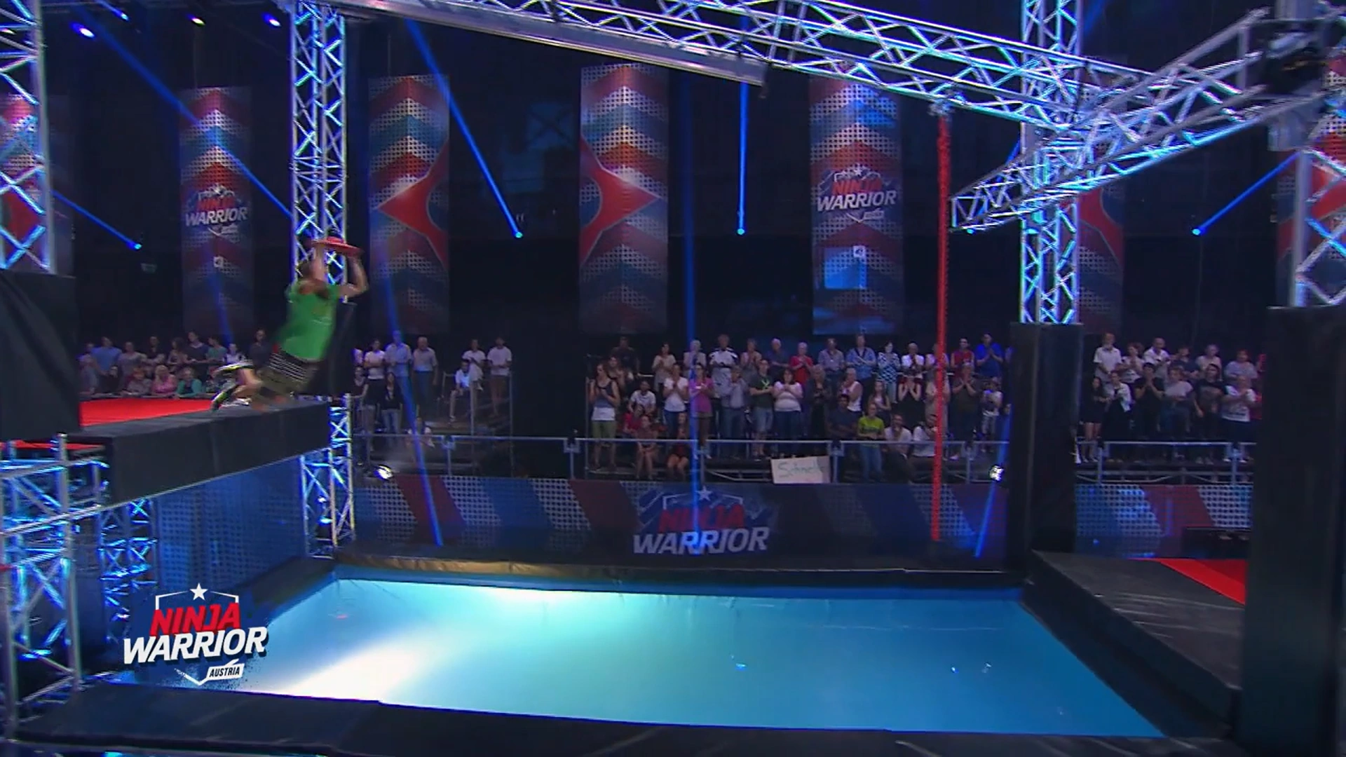 In Ninja Warrior Germany 1, the UFO, locally called Fliegende Untertasse (literally Flying Saucer), appeared as the second obstacle of the First Stage. The obstacle was similar to the one used in Ninja Warrior UK 2, albeit the disk was directly attached to the beam instead of the zip-line (similar to the Mini Silk Slider).