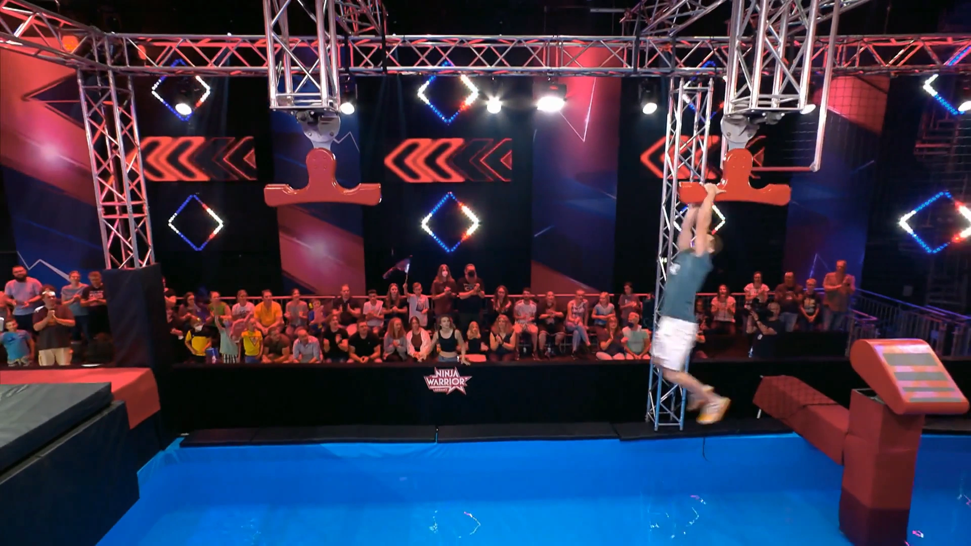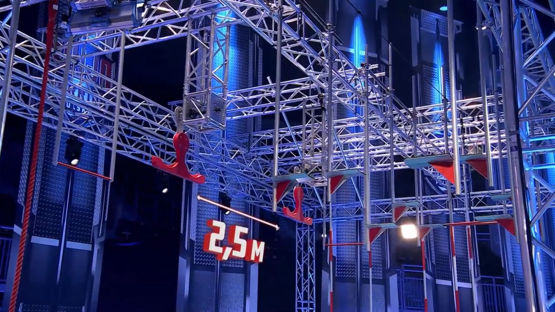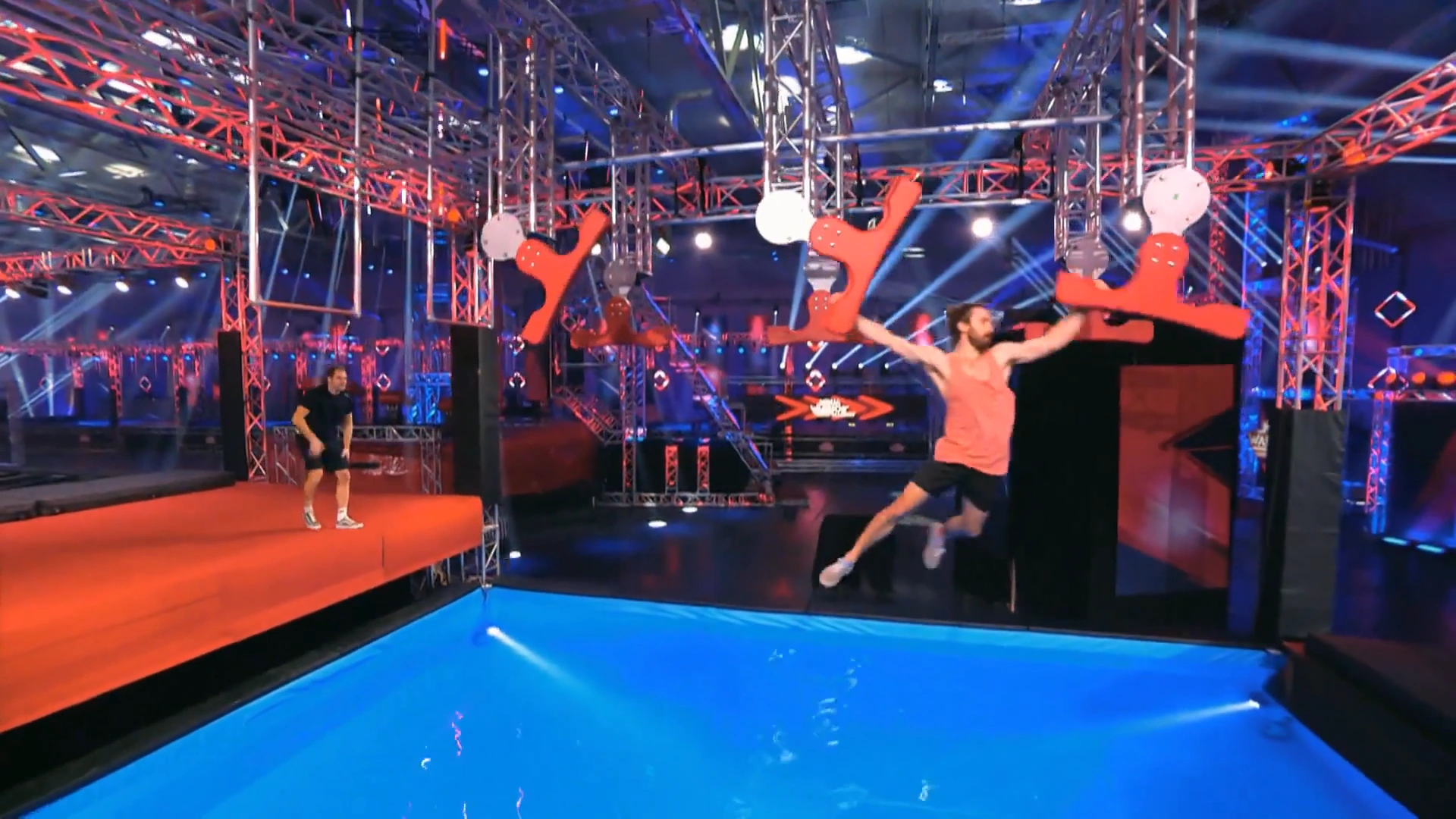 Competitors have to jump a trampoline and must grab a ledge which about 2 inches (5.08 centimeters) thick, which is shaped like a wingnut, and must swing horizontally to grab the second ledge. Then, they must repeat that to the third ledge, and swing to the landing platform to advance. The trampoline and the first ledge are parallel to one another. There is a transparent barrier placed on one side of every wingnut to force competitors to grab each nut laterally.