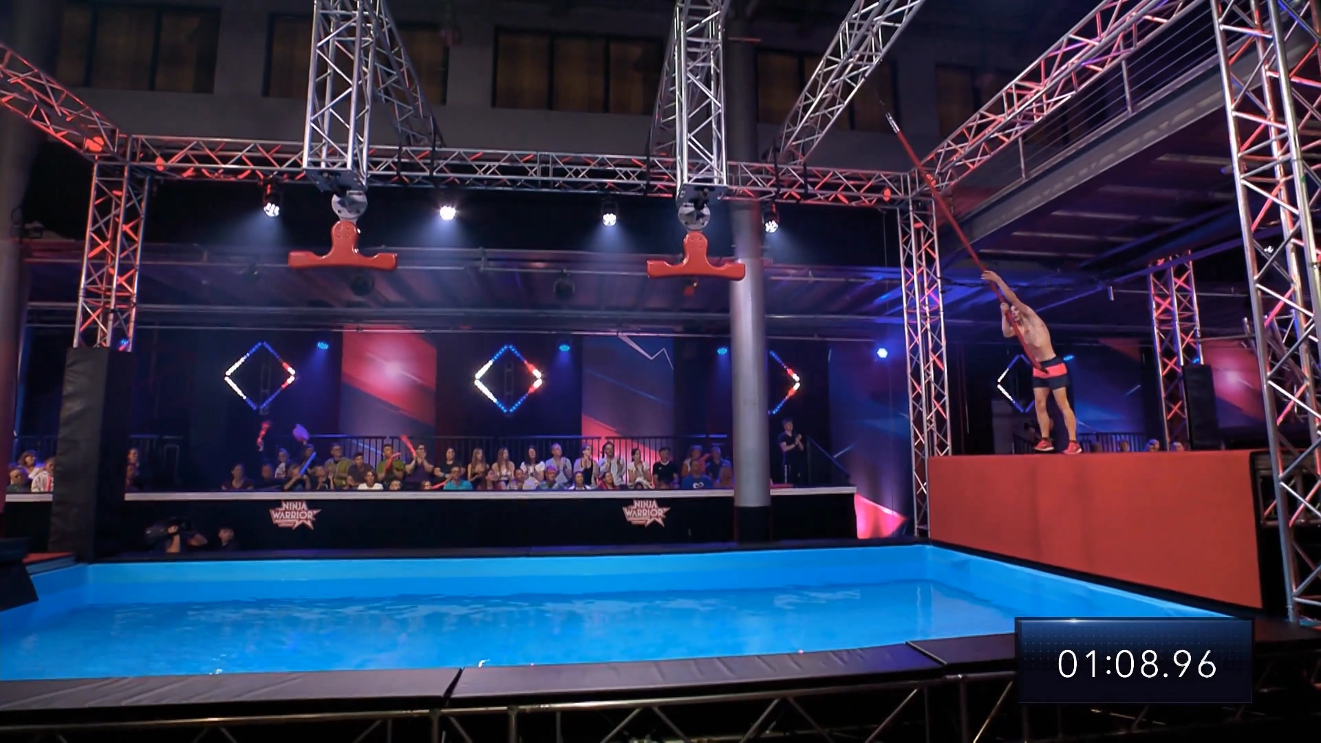 In Drew Drechsel's case, he overshot the distance from the third to the final wingnut, slightly injured his bicep and resulted in him not having enough swing and momentum to reach the landing platform.